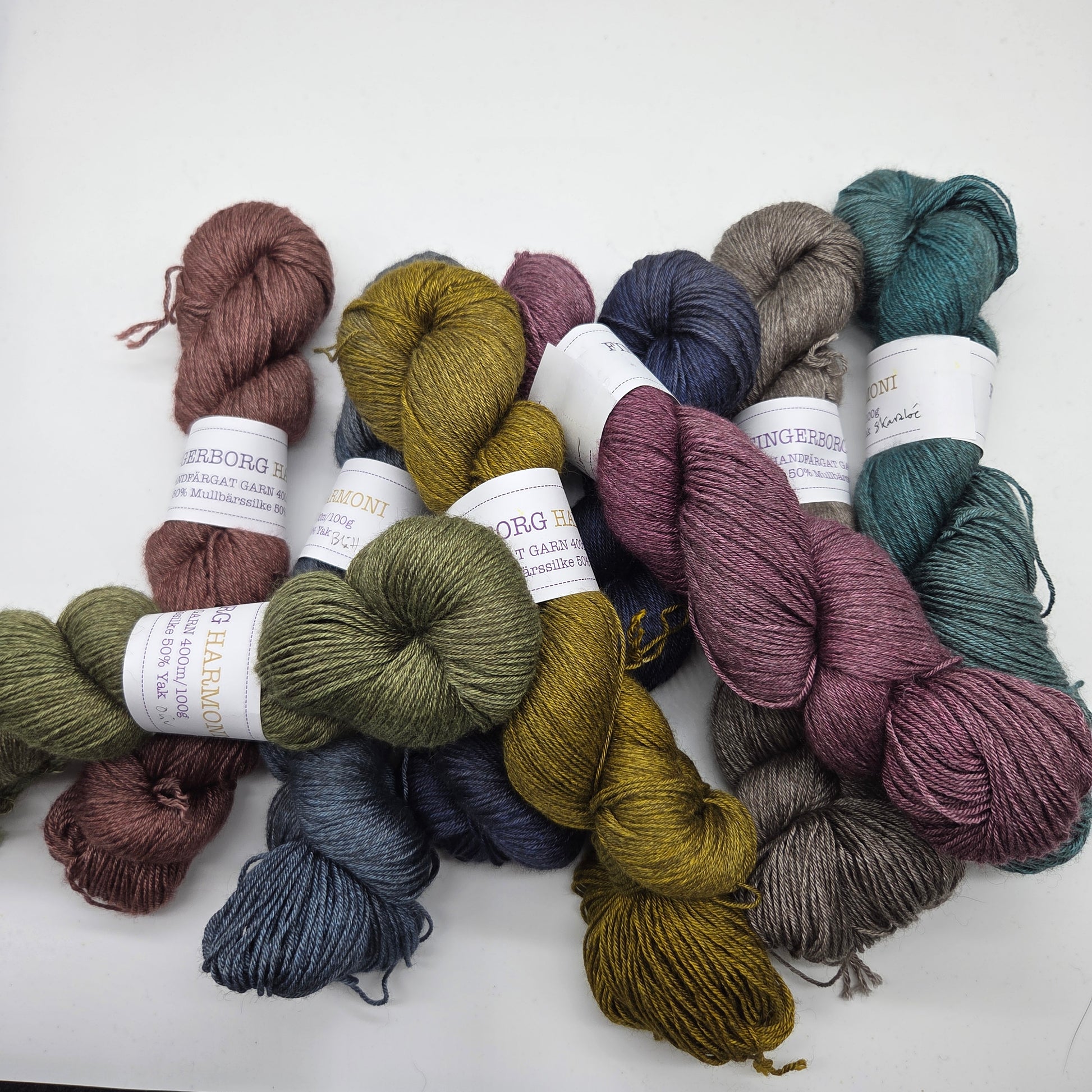 Harmoni är ett mjukt fingering weight garn. 400m /100g, 50% mullbärssilke, 50% yak. Garnet har mycket fall och en fantastisk lyster. Fiberblandningen gör att detta garn känns som ett light fingering garn. Ett härligt garn till sjalar eller andra kroppsnära plagg. Ej superwashbehandlat.